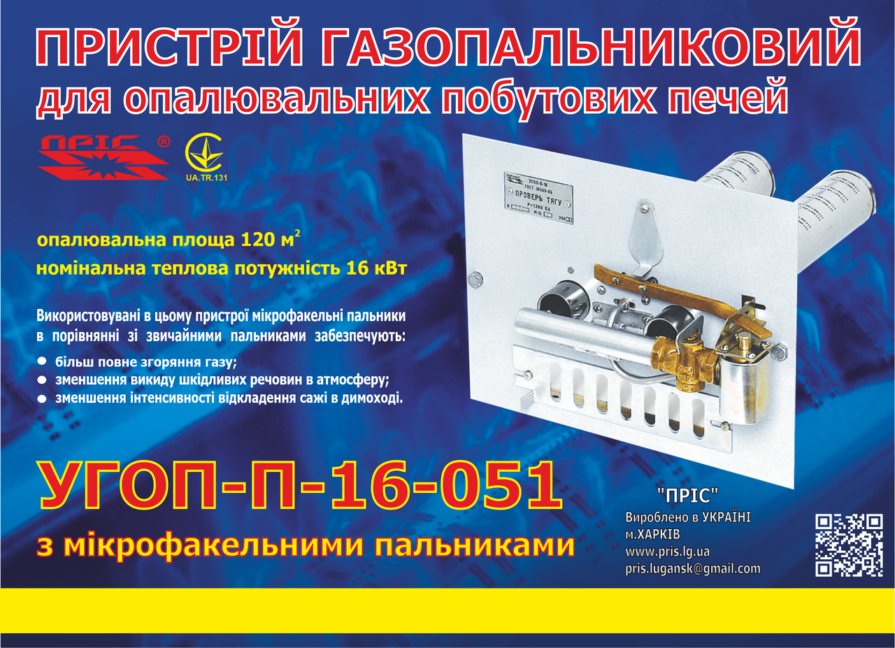 Газопальниковий пристрій УГОП-П-16 призначений для встановлення в опалювальні печі.